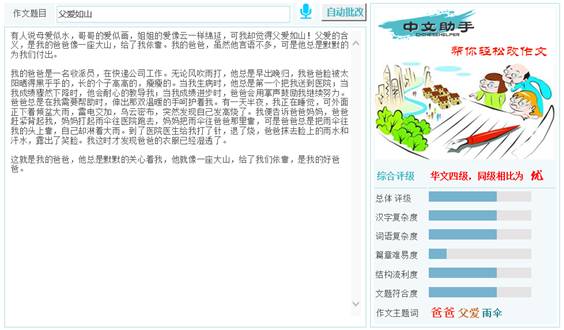 3、中文作文智能批改系统 面向中国中小学生、华裔华语学习者、汉语二语学习者,建立交互式的中文作文智能批改与评测平台,分别支持语文、华语、汉语作文的智能批改和评测。 演示地址:zwpg.languagetech.cn