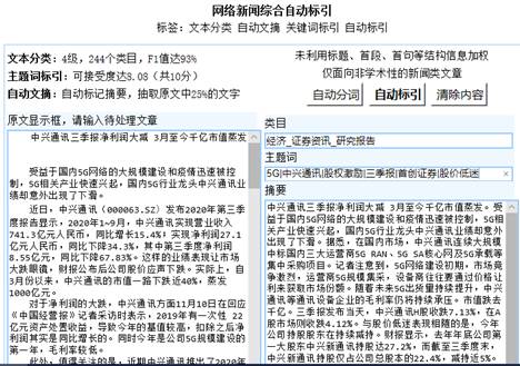 (一)基于内容计算的文本综合自动标引基于自主研发的中文信息处理技术,改进了特征提取方法,在大规模分类语料库中将具有较强特征表示功能的关键短语提取出来,并按主题聚类。在此基础上,以文本内容语义计算、文本内容自动标引为核心,完成了一个知识与统计相结合的文本分类、主题词标引、自动文摘系统,从而将文本内容以精练准确的形式标引出来,方便用户只须查看容量少信息量大的类目、主题词、摘要,即可快速把握文本内容,提高浏览效率。 演示地址 1、文本分类 立足于影响文本分类最底层、最根本的因素:文本表示中的特征项,利用表义完整的关键短语,提高特征项的完整独立程度,有效克服了传统分类算法中向量空间模型和贝叶斯假设的缺点,在3万篇测试集上(15大类,4级244小类),大类微平均提高了3.1%,小类微平均提高了15%。 立体模型是一个交叉多层级的系统。在纵的方面,是一个层级的系统,采用双向层级小类校正算法分类,一级级分到四层子类。在横的方面,采用兼类多标签分类策略,智能判断文档是否兼类,兼哪几类。大类微平均和宏平均F1值比扁平模型分别提高了1.8和2.7个百分点。 用户可根据需要在分类体系中动态增加删除类目,支持自动训练,提供新分类体系和相对应文档,能够自动训练、分类;交叉多层级立体分类,支持多级分类,可选兼类;分类方法支持领域知识、统计等多种方法。 2、主题词标引 针对主题词的领域不均匀性和邻界域两个特征,首创并模拟计算了主题词表征文本主题特征程度的主题度。结合方差和TFIDF原理,设计了形式化的主题词计算模型。以主题词及其主题度为领域知识,结合统计方法,形成了一个知识与统计相结合的主题词自动标引系统。 系统支持叙词标引、自由词标引、关键词标引,支持文档主题词多级标引;支持基于专家知识的规则标引或纯粹词语计算的统计标引;支持自动训练,无需提供训练文档集即可实现新文档的自动标引。 3、自动文摘 系统基于词语的主题度计算,自动抽取文献关键性句子形成摘要(原文中约20%的文字,可自定义)。 能够以多级体系的形式生成并管理标引词库,可动态编辑、修改、维护标引词;支持自动训练,无需提供新摘要文档语料库,即能实现新文档的自动摘要;摘要可读性强,能覆盖原文献主题。 4、学术贡献与创新性 提出了关键短语的概念,并将之作为文本表示的典型特征,进一步在实验中证明了关键短语比词更适合作为文本表示的特征,能提高文本分类的效果。 通过调节词频的方根,将领域通用词语和领域专类词语结合起来进行词语聚类。 将贝叶斯分类中的频率加权方法改进为频率与词语类别区别度开立方乘积的加权方法,充分利用了大规模语料库的领域知识,实验证明该改进大幅提高了分类效果。 提出了在类别判断时,采用小类校正的方法来提高大类准确率的方法。 在文本分类中,通过判断相似度的最大值和第二大值的比值是否小于阈值来确定文档是否兼类。 提出了细致完整、有一定可操作性的关键词标引的多点综合测试方法,在理论上较好地解决了关键词标引测试难的问题。 该系统为新闻门户网站、图书情报部门、广告公司、汉语教学机构等提供内容计算和管理的解决方案。目前,系统已应用于机械工业研究院、万方数据、北京旗帜创想等机构和公司。 (二)计算语言学辅助汉语智能教学1、汉语智能教学大数据与辅助软件平台 建设了大规模的汉语教材语料库、汉语/华语学习者分级的作文库、汉语口语话题库、各种话题分类词表及大纲;建设了分级的搭配库和例句库、常用词语释义图片库。 构建了“汉语助教”辅助汉语教学软件平台。包括词句篇难易度计算、词语分类聚类、搭配抽取、文本指难、教材生词自动生成与等级分布统计、作文智能评测及批改、领域汉语教学辅助、智能备课等功能模块。 2、字词、句子、段落篇章难易度计算 词语常用度就是词语在时间和空间上均匀分布的程度,可以通过方差和IDF来模拟。 影响篇章段落难易度的因素主要有:段落句子数(句子越多,相对越难)、段落中所有句子难易度的均值、段落中最难句子的难易度(学习者可能因为某一难句而难以理解文意)。 同理,影响句子难易度的因素主要有:句长、句中所用词语难易度的均值、句中难易度最高词语的难易度。句子难易度也可通过这三个因素来综合模拟。 目前,该方法已用于作文智能评测和分级、汉语教材编写难易度分级等领域。 3、汉语教学词汇等级大纲、话题聚类词表 利用独创的文本分类的特征提取算法进行词语的领域聚类,基于汉语教学语料库和词语难易度计算、词语聚类方法,构建了汉语口语、商务汉语、旅游汉语、华文教育的分级分类词汇等级大纲、话题聚类词语表。 其中,汉语口语词汇等级大纲、商务汉语分级词汇等级大纲、华文水平测试词汇等级大纲,以及话题/主题/功能分类的汉语口语、商务汉语、少儿华语的聚类词语表库具有极高的首创性和原创性,对于领域/职业汉语/华语教学和测试具有重要价值。 4、智能汉语影视教学 以常见话题库为纲,截取热门影视剧中相关度高的视频片段,构建话题对应的影视对话字幕库及其对应的影视频库;对各个片段标注场景,按照会话片段与话题的相关程度及片段难易度进行排序分级,方便针对不同层次的汉语教学